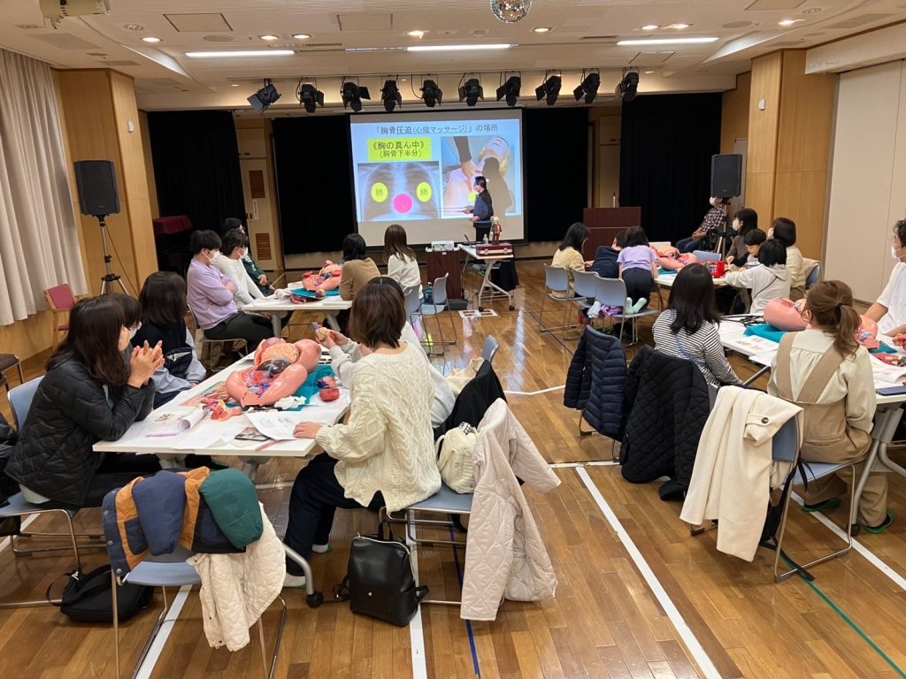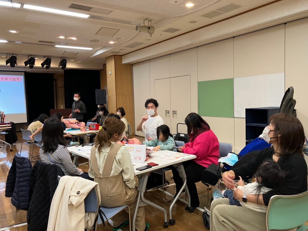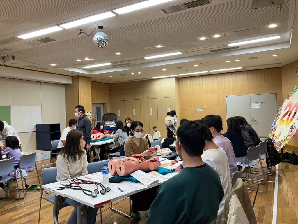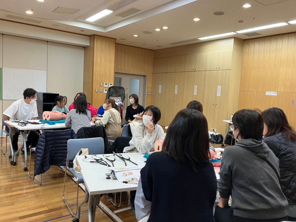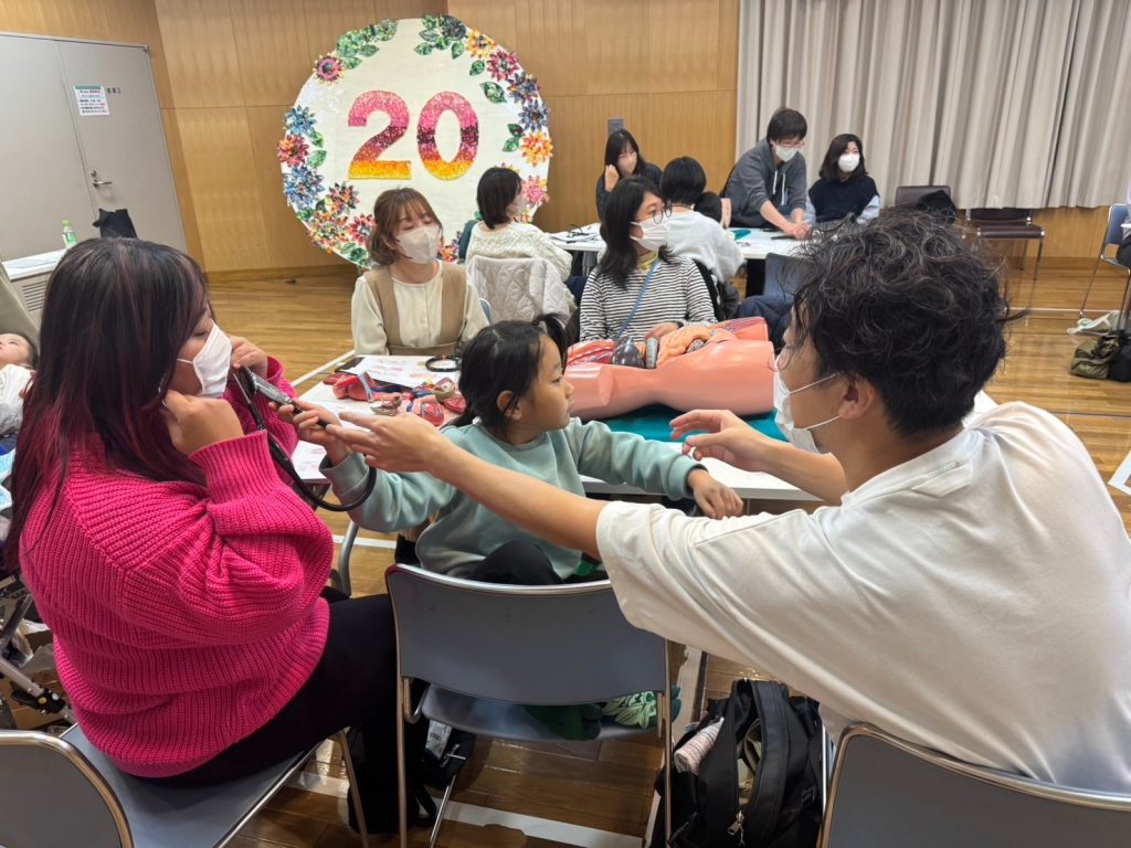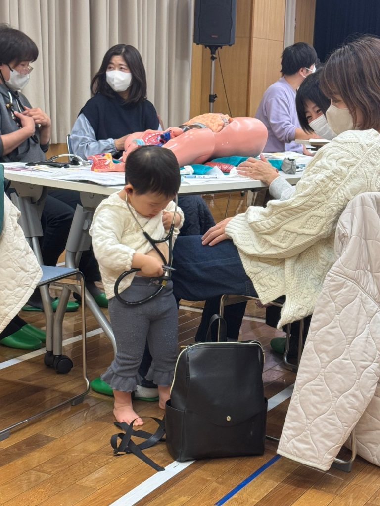 お子様も混ざって聴診器を触って学ぶ時間。